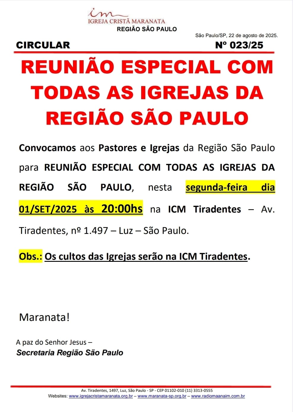CIRCULAR Nº 023-25SP – REUNIÃO ESPECIAL TODAS AS IGREJAS DA REGIÃO SÃO PAULO