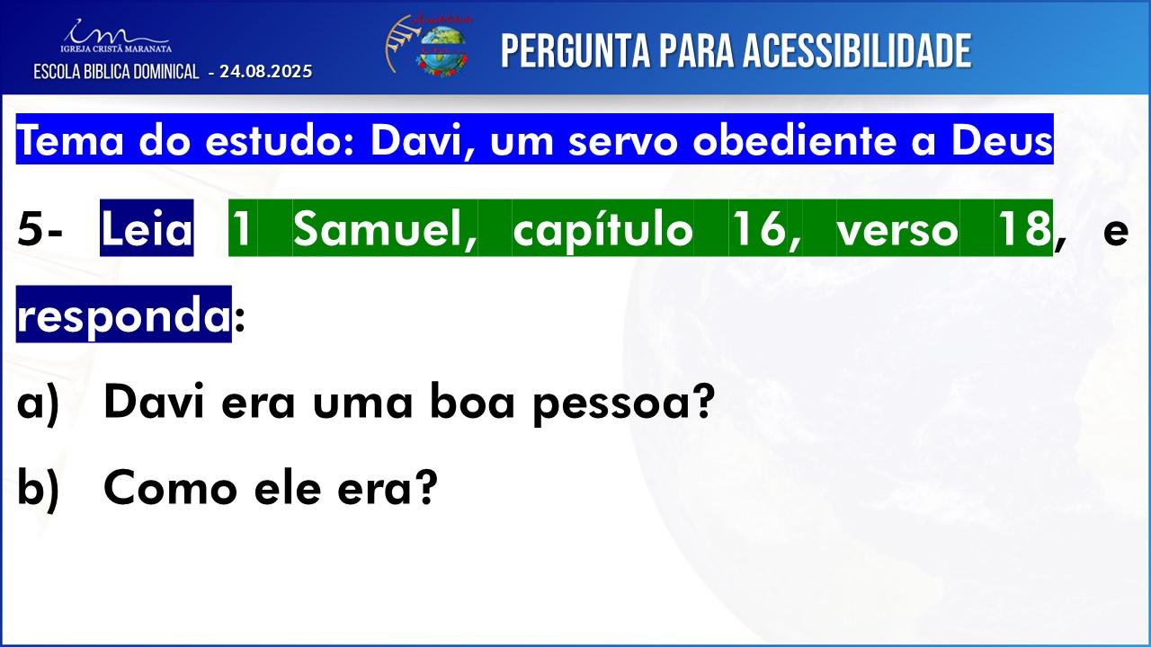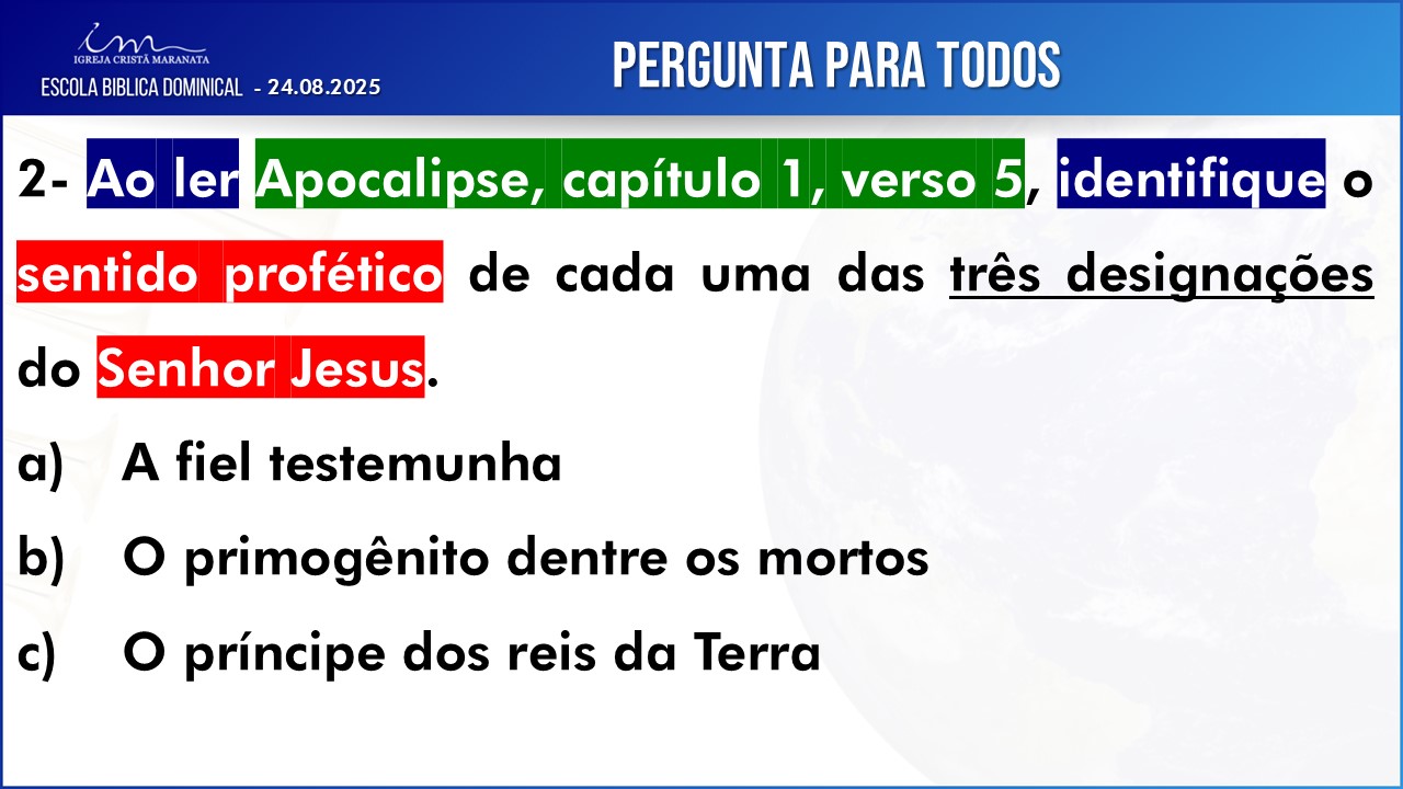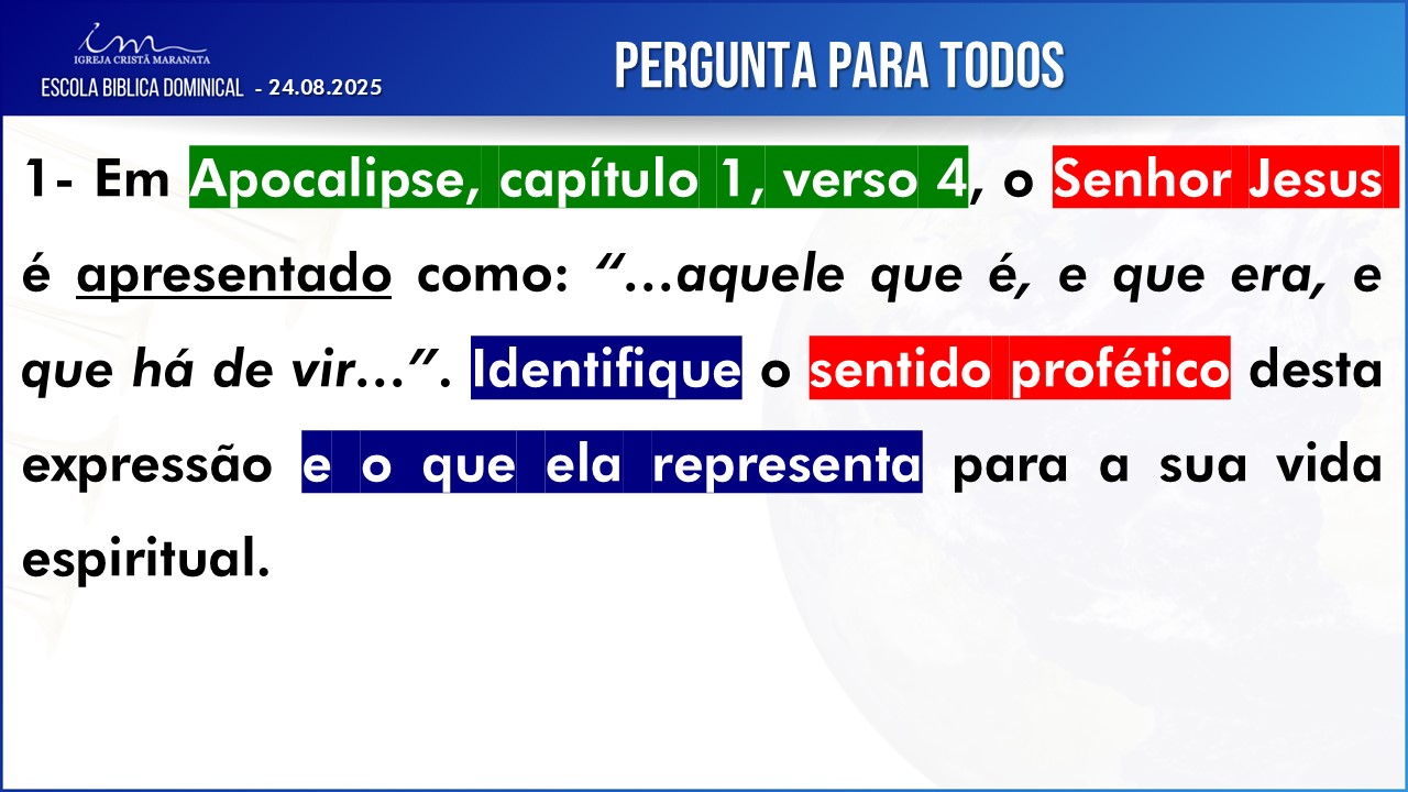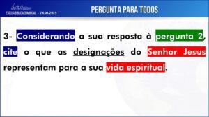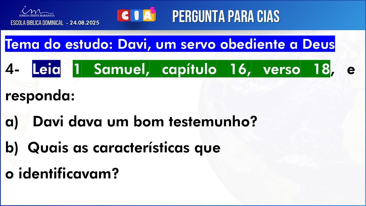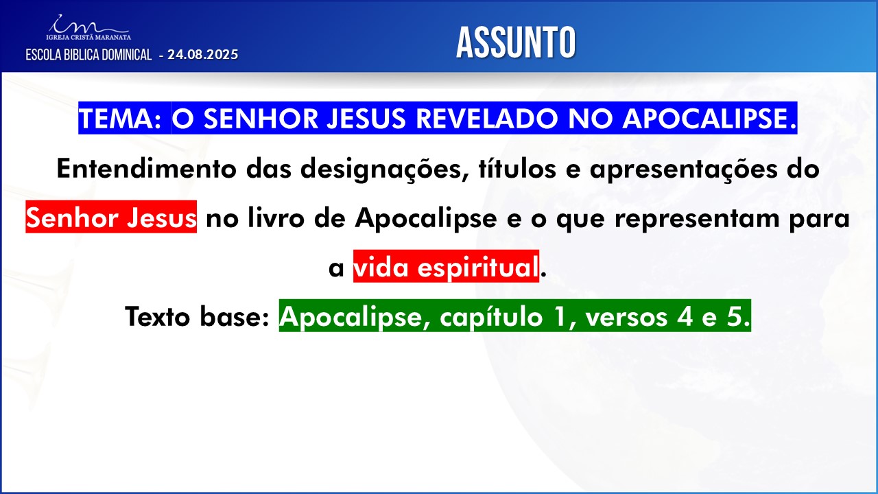 Informamos aos Pastores e às Igrejas que, a partir do próximo domingo, dia 24, durante a Escola Bíblica Dominical (EBD), as classes de Crianças, Intermediários e Adolescentes (CIAS), deverão receber a imposição de mãos e permanecer no templo até a abertura do Satélite e transmissão da pergunta direcionada às mesmas.
