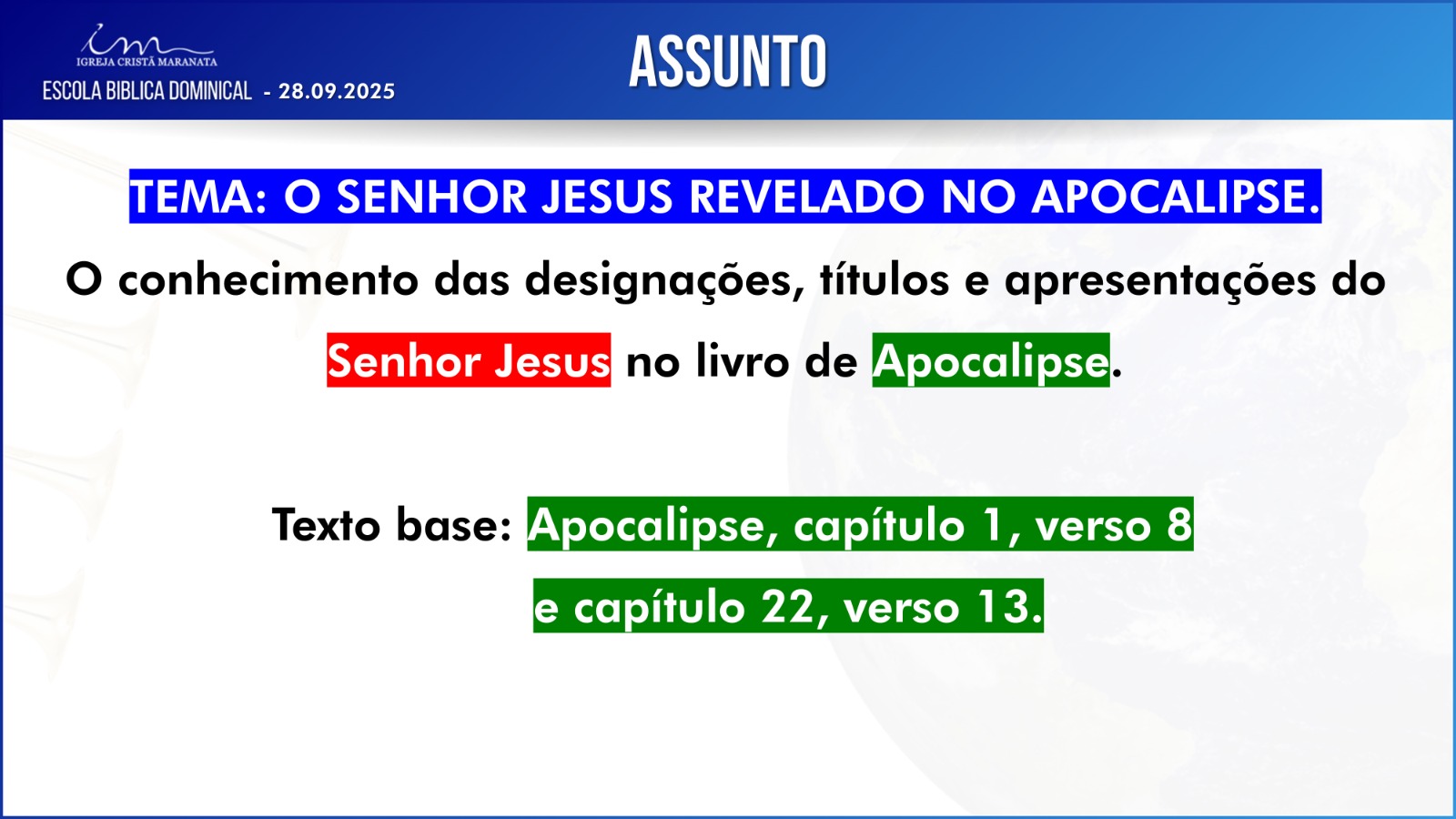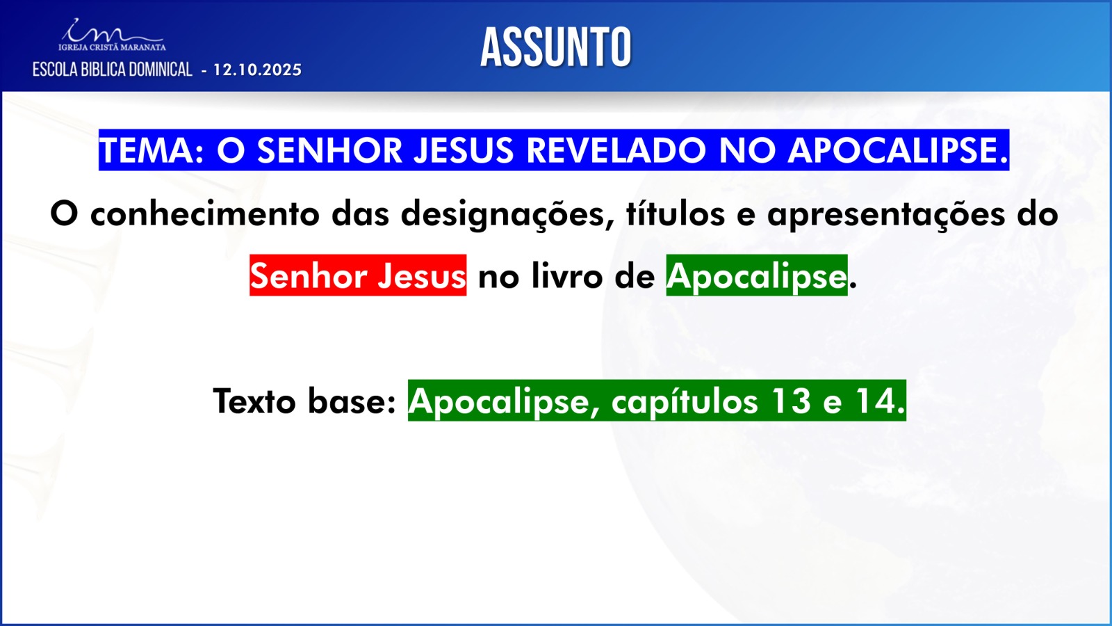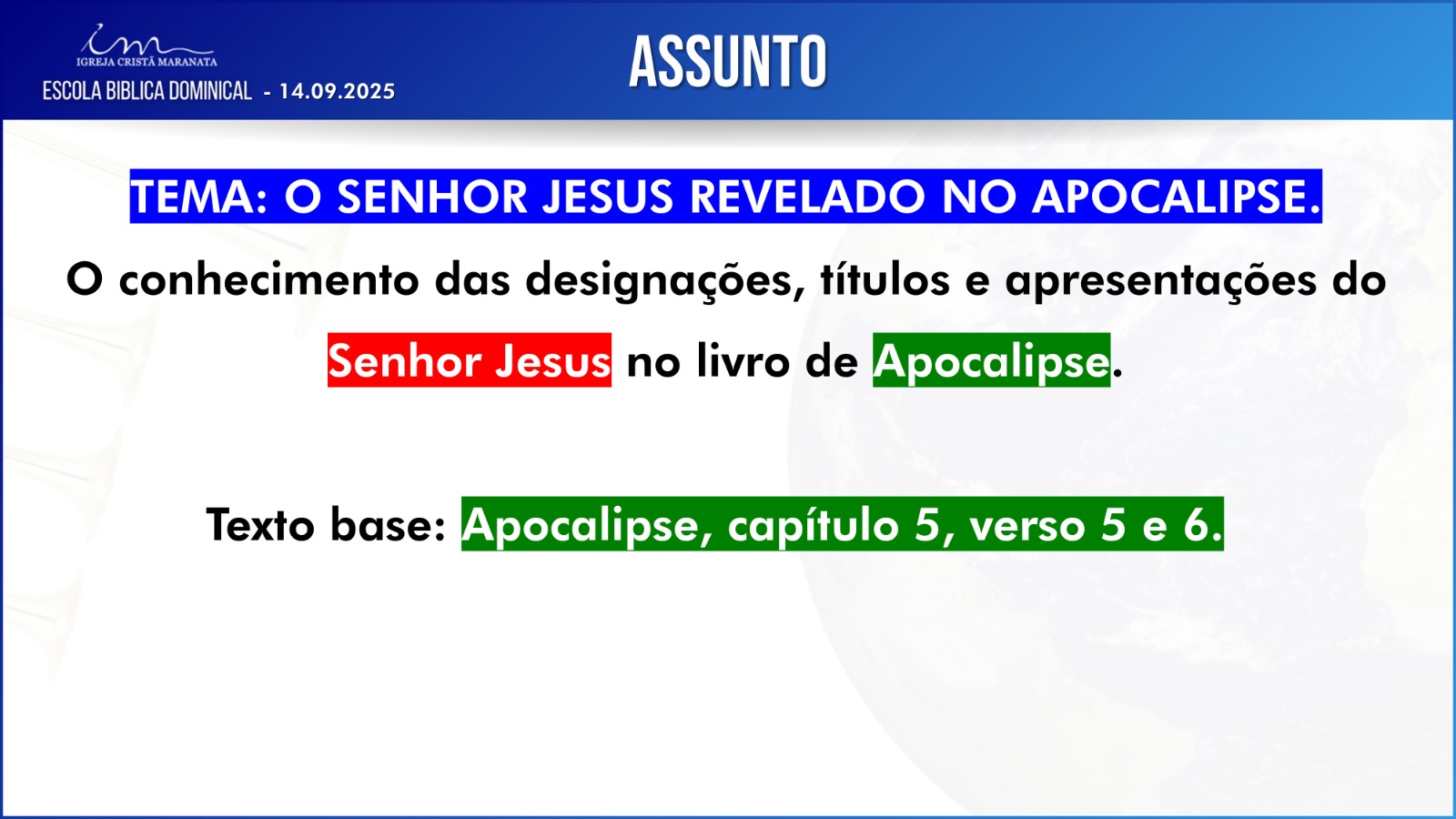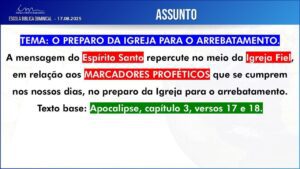 Não haverá necessidade de apresentação das respostas da Escola Bíblica Dominical (EBD) durante esse Culto.